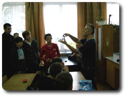 Dnia 23.10.2011 r. w klasie III a naszego gimnazjum odbyła się nietypowa lekcja fizyki, której towarzyszyło praktyczne przedstawienie różnych zagadnień fizycznych. Celem pokazu było zainteresowanie uczniów fizyką. Obserwowaliśmy zarówno te eksperymenty, które do przeprowadzenia wymagają wykorzystania przedmiotów i substancji codziennego użytku (koła od roweru, butelki plastikowe, chrupki, woda), jak również wymagające zastosowania nowoczesnych technik laboratoryjnych (doświadczenia z ciekłym azotem).